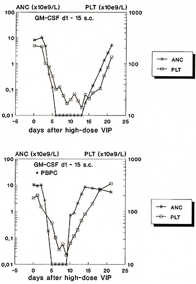 treated with GM-CSF +- PBPC support. PBPCs in this patient were