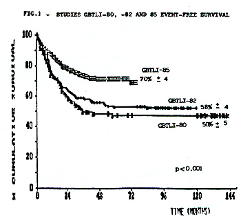 The life table analysis for event free survival EFS representing the evaluation of all adverse events (non-responders, deaths and relapses) for all risk groups, according to each study, is depicted in Figure 1. The projected EFS rates are 50% (SD 5%) after 12 years in study GBTLI-80, 58%(SD 4%) after 10 years in study GBTLI-82, and 70%(SD 4%) after 6.5yr of the GBTLI-85.