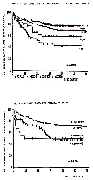 The EFS, according to the initial leucocyte count in GBTLI-85 study, is represented in Fig. 3. 78% of the children with less than 50,000 WBC/mm³while only 50% of those with more than 100,000 WBC/mm³ at diagno