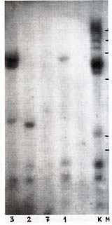 Fig.1. Southern analysis of PstI digests of baboon lymphoma DNA. 1-10, sample numbers the same as in Table 1; K,