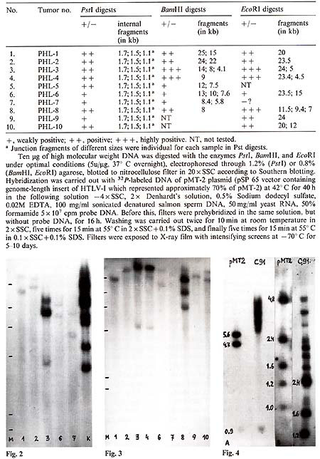 Our previous studies have shown that hamadryas baboons of the Sukhumi "high lymphoma " stock are infected with human T lymphotrophic virus (HTL V)-I-related virus to a significantly higher degree than baboons of different lymphoma-free populations. Levels of anti-HTL V -I-related antibodies in prelymphomatous baboon sera were also significantly higher than those in matched controls [1,2]. These studies posed the question ofwhether HTL V -I-like virus is etiologically related to baboon malignant lymphoma. The most informative indirect approach to the study of this possibility is the search for integrated provirus in baboon lymphoma DNA. Thus, we tested by Southern blotting Pstl, BamHI, and EcoRI digests of high molecular weight baboon lymphoma DNA, using as a probe genome-length HTLV-I cloned in SstI site ofpSP-65 vector (this molecular clone was kindly provided by Dr. R. Gallo). Ten PstI-digested lymphoma DNA samples (lymphomatous lymph nodes) were found positive (Table 1). The band pattern was similar to, but clearly different from, that characteristic f or HTL V -I (cf. Figs. 1, 2, 4). At least three fragments (1.7 kb, 1.5 kb, and 1.1 kb) were observed in all samples (Table 1; Fig. 1 ). They were thought to be internal fragments [3]. In each positive sample "individual" bands were also found that suggest monoclonal ( or oligoclonal) integration of HTL V -I provirus into different sites in baboon lymphoma DNA (Fig.1). This suggestion was proved correct by Southern analysis of BamHI and
