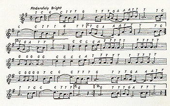 Fig. 11.32. Transcription of the Beatles' "Yellow Submarine" (John Lennon and Paul McCartney, 1966) into its base sequence. Repeats of base oligomers are evident. Striking is the abundance of thymine which occurs almost six times more frequently than adenine. It is extraordinary that no initiator nor terminator codon is employed, at least in the first critical six lines. The expression of this sequence, that is its polypeptide chain, bears interesting features. The amino acid polymer has a hydroxyl (serine) beginning and serine reappears at the start of the next four lines too. High aromaticity (phenylalanine) throughout the score is striking. Sulfur-crosslinkage via cys teine (cys) nicely connects the general theme. The rest are fillers except for a few basic amino acids which appear to give the beat. In summary, serine may stand for silk, phenylalanine for skin, and cysteine for hair, all three of which are a Beatles' trade-mark. However, the most refined phenomenon is the presence of a single tryptophane -almost at the end. This amino acid releases upon digestion indols which are known to put you nicely to sleep. This may suggest, that the air in the "Yellow Submarine" was eventually either low in oxygen, or high in carbon monoxide or both